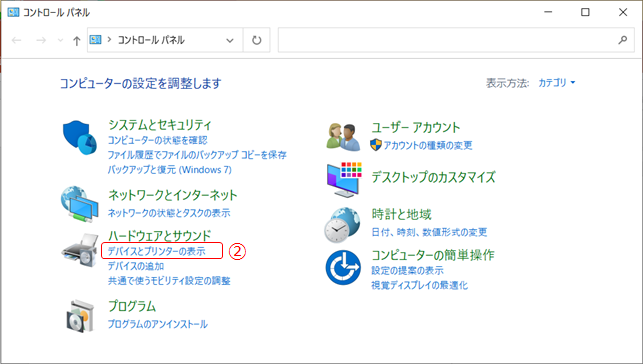 ② コントロールパネルが表示されたら、「ハードウェアとサウンド」の下の「デバイスとプリンタの表示」をクリックします。