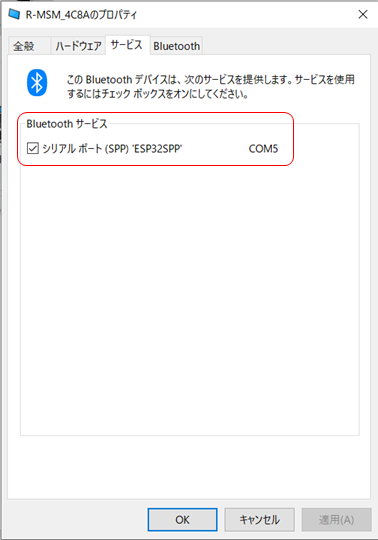 ここでは、「シリアルポート(SPP) ‘ESP32SPP’ として “COM5”が割り付けられています。