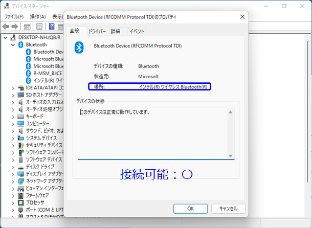 通信できない場合は、デバイスマネージャーの“Bluetooth”の“Bluetooth Device(RFCOMM Protocol TDI)を選んで、アダプタのメーカーを確認ください。